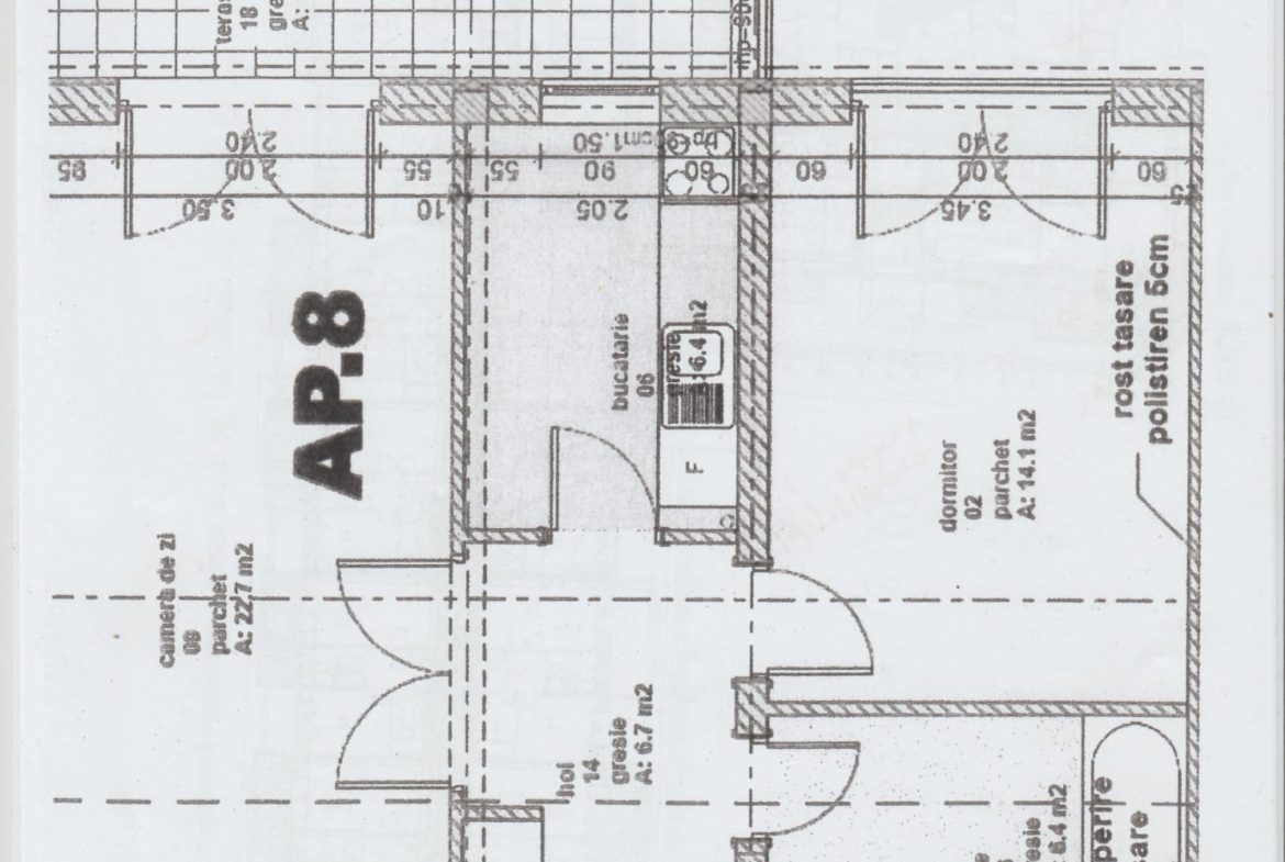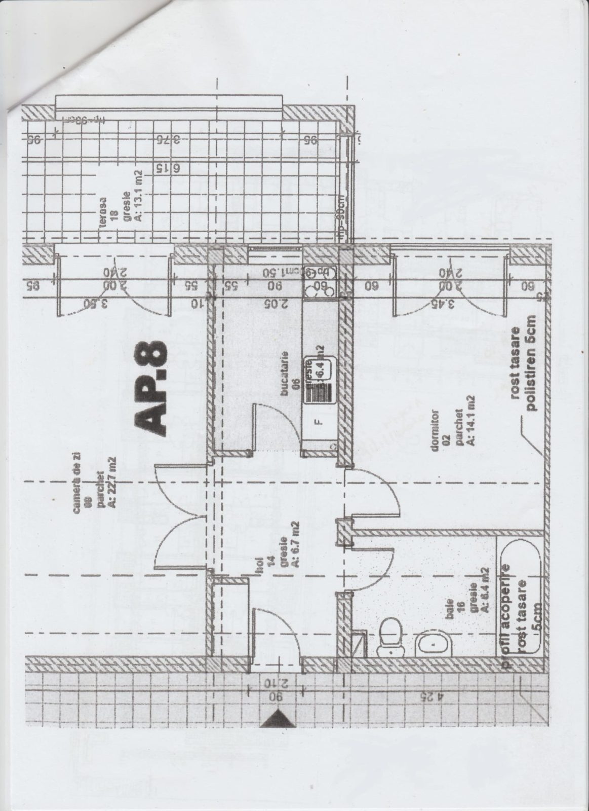Compus din living 22 mp cu iesire spre terasa, dormitor 14 mp, bucatarie, baie, hol.